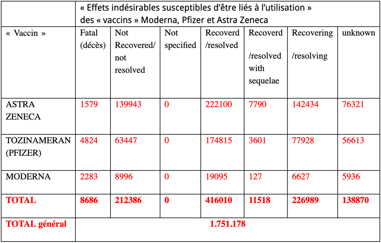 Le total des « effets indésirables susceptibles d’être liés à l’utilisation de médicaments » mis à jour le 24 avril 2021 se monte à un million sept cent cinquante et un mille cent soixante-dix-huit, dont 1 335 168 effets secondaires non résolus ou « en cours de résolution », soit une augmentation de 170% d’effets secondaires non résolus en trois semaines seulement par rapport au 3 avril (voir les chiffres du 3 avril dans mon précédent article).