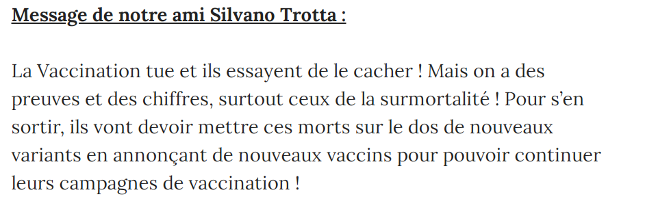Et de plus les laboratoires ne garantissent contre la contagion ou la guérison et contre les variants c'est mystère et boule de gomme. Si vous demandez à votre médecin ce qu'il y a dans ces injections on a le droit à des réponses vagues de la part des médecins qui n'en savent pas plus que nous et qui pourtant obtempèrent dans le flou des infos vaguement fournies par les labos souvent croyant bien faire ou assurant le jack-pot .
