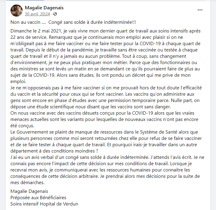 20 avril: ▶"Un Landais de 75 ans est décédé en février, 12 jours après avoir reçu une dose du vaccin Pfizer. Ce retraité n'avait aucun problème de santé selon ses proches. Sa famille s'interroge sur le lien de causalité et a décidé de déposer plainte"