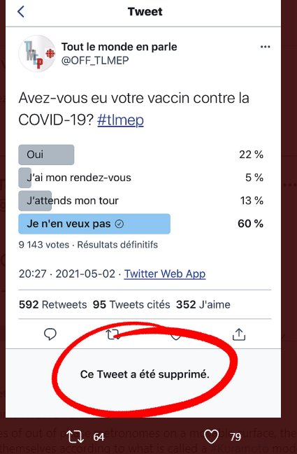 Jean-Eudes Fresneau a retweeté Corinne Reverbel @CorinneReverbel · 14h Déjà rien qu'avec ce seul décès d'un jeune homme de 24 ans en bonne santé à cause du vaccin, le gouvernement DEVRAIT STOPPER NET la vaccination des JEUNES Ils ne pourront pas dire qu'ils ne savaient pas AUTOPSIE=> LIEN DE CAUSALITÉ RENFORCÉ VACCIN/DÉCÉS