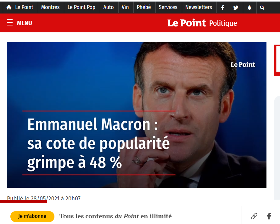 "Le Point" affichait hier que notre président malgré les impairs de la crise sanitaire caracole dans les hautes sphères .Un président qui a une cote de popularité de 48 % n'a pas besoin de 737 agents de sécurité au service de l' Elysée et d'une cinquante de flics en civil pendant ses déplacements bucoliques . Quand René Coty allait acheter " l' Equipe" au kiosque du coin, car son épouse l'oubliait souvent, il n'y avait pas un flic pour faire un brin de causette en route .