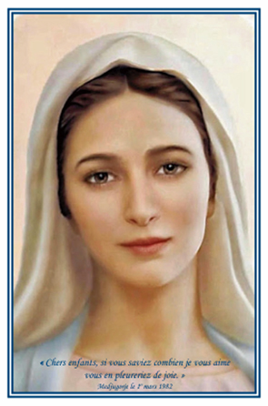 “Chers enfants ! Je vous regarde et je vous appelle : revenez à Dieu car il est amour et il m’a envoyée à vous par amour pour que je vous guide sur le chemin de la conversion. Abandonnez le péché et le mal, décidez-vous pour la sainteté et la joie régnera, et vous serez mes mains tendues dans ce monde perdu. Je désire que vous soyez prière et espérance pour ceux qui n’ont pas connu le Dieu d’amour. Merci d’avoir répondu à mon appel.”
