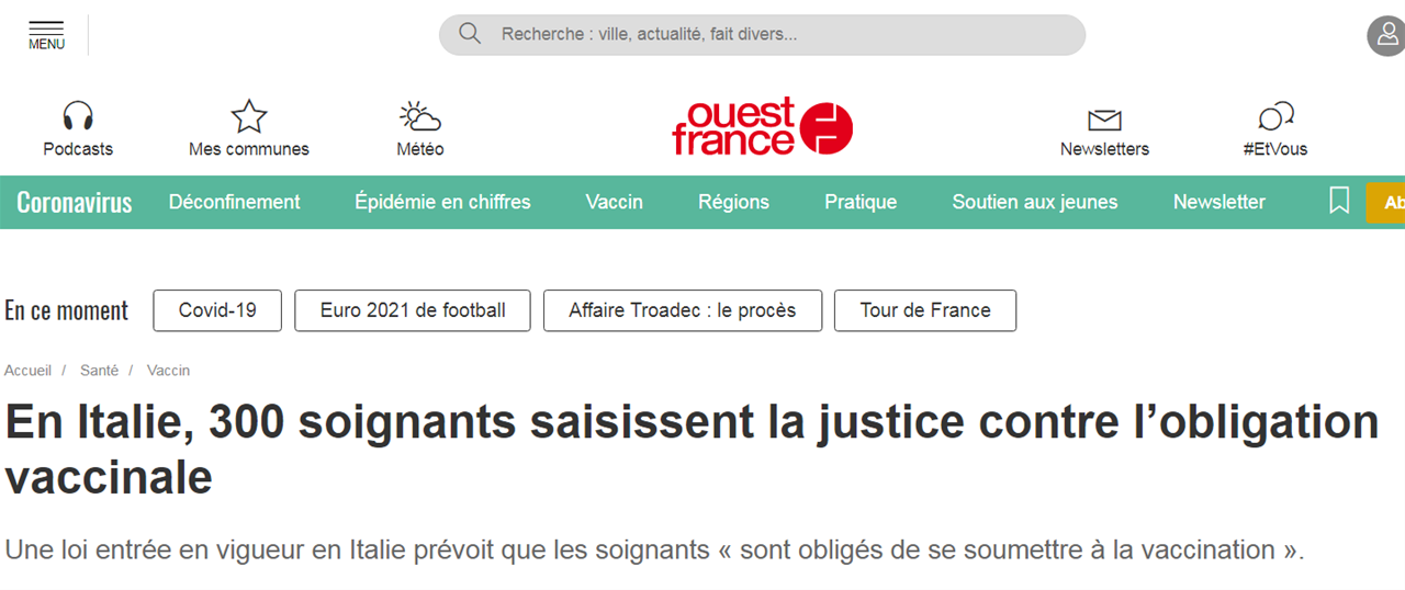 📡🔌🙋♂️👉 @stopnwofrancetv Ouest-France En Italie, 300 soignants saisissent la justice contre l’obligation vaccinale Une loi entrée en vigueur en Italie prévoit que les soignants « sont obligés de se soumettre à la vaccination ».