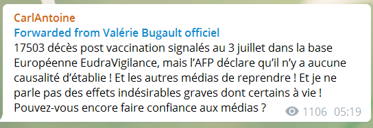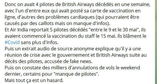 Philippe Murer Drapeau de la France a retweeté Laure Gonlézamarres @LaureGonlezamar Ce soir, appel d'une copine. Elle a fait un resto ce midi avec 25 collègues : 12 vax, 13 non vax (dont elle). Résultat : sa responsable a fait la seconde dose hier, elle est en arrêt pour 15 jours ; un collègue a eu une myocardite "mais tout va bien" ; les autres... 2:17 AM · 1 juil. 2021·Twitter for Android