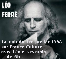 2 sur 4 :Une nuit avec Léo Ferré entouré de ses amis, avec un long entretien et des chansons - 1988 La nuit du 1er janvier 1988 France Culture nous offre une des plus emissions de la radio avec léo Férré , plus de 6 heures d'emissions d'entretiens, de reportages et de reflexions de Léo Férré on traverse un demi siècle de 1920 à 1980 , la années souvenir du poète et du chanteur que nous aimons tous .... le blogueur.