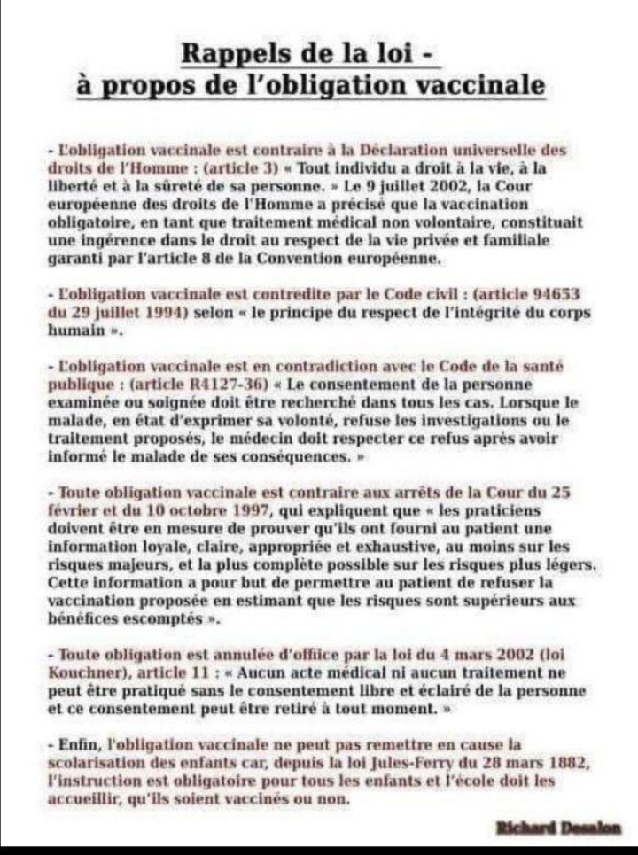 Laissez-la tranquillement avancer en restant vigilants, mais plus que jamais combattants ! Les loups sortent du bois et mettent les bouchées doubles. Ils se ridiculisent et montrent enfin leur vrai visage. C’est toujours ainsi que les choses se passent lorsque Satan et ses complices sont à juste titre malmenés. L’institut apprenti sorcier qui a collaboré à la conception de ce virus caméléon, va tirer sans aucune honte la sonnette d’alarme. Sachant distiller la parole, de grands communicants brameront que les non vaccinés sont trop nombreux et qu’il faut de gré ou de force les contraindre aux injections ! Leurs chiens de garde corrompus – petits roquets de porcelaine –, sont déjà montés au créneau ! Combien vous faudra-t-il de démonstrations provocatrices pour comprendre que les liens d’argent sont éclatants, entre empoisonneurs et supposés soignants ? De grâce, soyez confiants et demeurez patients. L’immense précipice n’est plus très loin et se rapproche dangereusement. Les traîtres s’y précipiteront les premiers entraînant avec eux la cohorte de leurs fidèles marchepieds. Ce que ces sots ont oublié, quand bien même ils veulent vous effrayer, c'est que vous ne vous laisserez jamais impressionner ! Il est grand temps pour les naïfs ou incroyants de prendre la mesure du temps. Nul doute qu’une nouvelle boussole saura leur épargner le pire. Qu’ils s’en emparent dès maintenant ! »