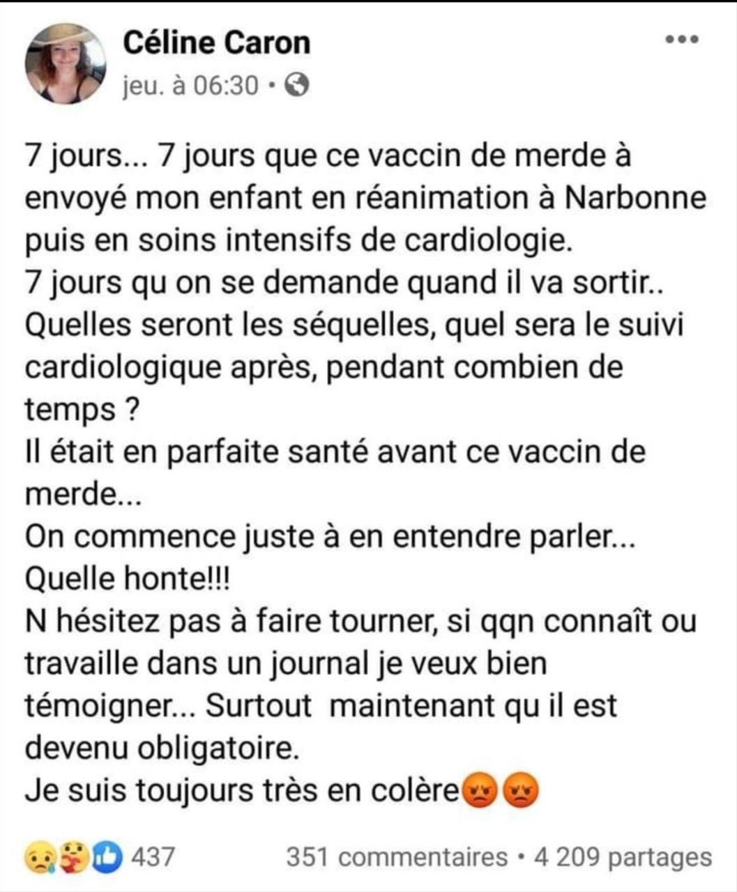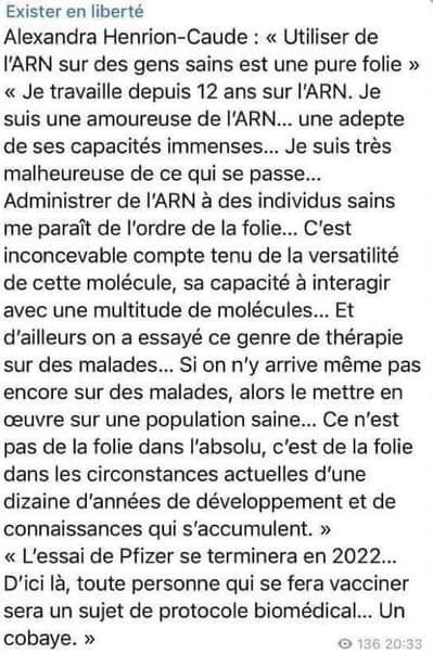 Enfin tout le monde voit bien que les médias en place et les gouvernants sont aux services des laboratoires internationaux qui nous vendent des vaccins pas finis encore en phase d'expérimentation pour des adultes non consentants car on leur ment et ces derniers prennent la peine de lire une notice pour installer leur nouveau barbecue acheté la veille mais ne lisent pas celle des vaccins produits d'ailleurs pour certains par des sociétés qui ont été condamnées pour fraudes et dissimulations de faits (1+2).Plus on creuse, plus on s'aperçoit que rien ne tient debout dans cette affaire et que tout a été mal ficelé pour attraper le jobard .