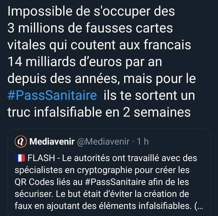 Nos politiques sont des citoyens comme nous le fait d'exiger à un gamin de 14 ans ou à un vieux de 80 ans une autorisation sanitaire pour boire un café ou acheter une boite de conserve, si ils approuvent cette imbécilité alors là, il n'y a plus rien à esperer de la classe poltique, il n'y a plus de contre pouvoirs chez nous, c'est pour ça qu'on nous balacent des rêgles aussi iniques et absurdes et que la liberté ne veut rien dire pour ces gens là.