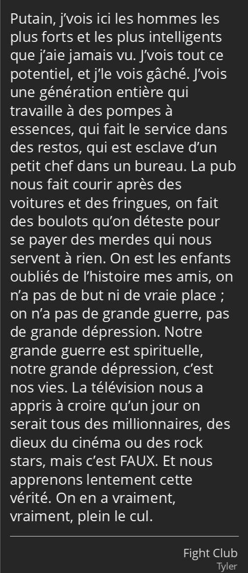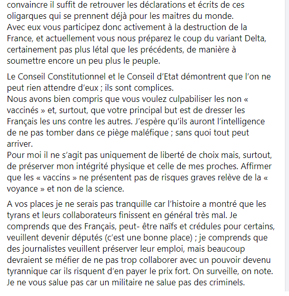 Bernard Guy il y a 6 heures Depuis plus de 50 ans je suis en bonne santé , sans faire gaffe plus que cela , sauf que j'évite les médicaments lorsque j 'estime ne pas en avoir besoin . Le seul vaccin qu'on m'a inoculé fut en 1981 au service militaire ,et je m'en souvient encore , nous fumes toute la chambrée ko au moins 2 jours , toutefois les autorités nous avaient accordés un repos en chambre , ensuite c'était un assortiment de 4 vaccins qui avaient été testés bien auparavant . Combien de personnes vivent dans mon cas en écoutant leur horloge sanitaire intime sans se faire de soucis en évitant les médicaments lorsqu'il y a pas lieu d'être. Depuis 5 ans ,les mensonges des gouvernances s'enchainent à la vitesse de la lumière. Pourtant, je n'ai toujours pas peur de ce coronavirus , mais soudain une frayeur me saisi, celle de perdre ma liberté fondamentale , celle qui me fait vivre heureux et en homme libre et éclairé . Par contre, je suis vraiment angoissé à l'idée que l'on m'injecte un vaccin qui ne me semble pas fiable et qui me pose des interrogations sur sa véritable finalité, car comme tout homme censé devrait le faire , réfléchir aux conséquences futures .
