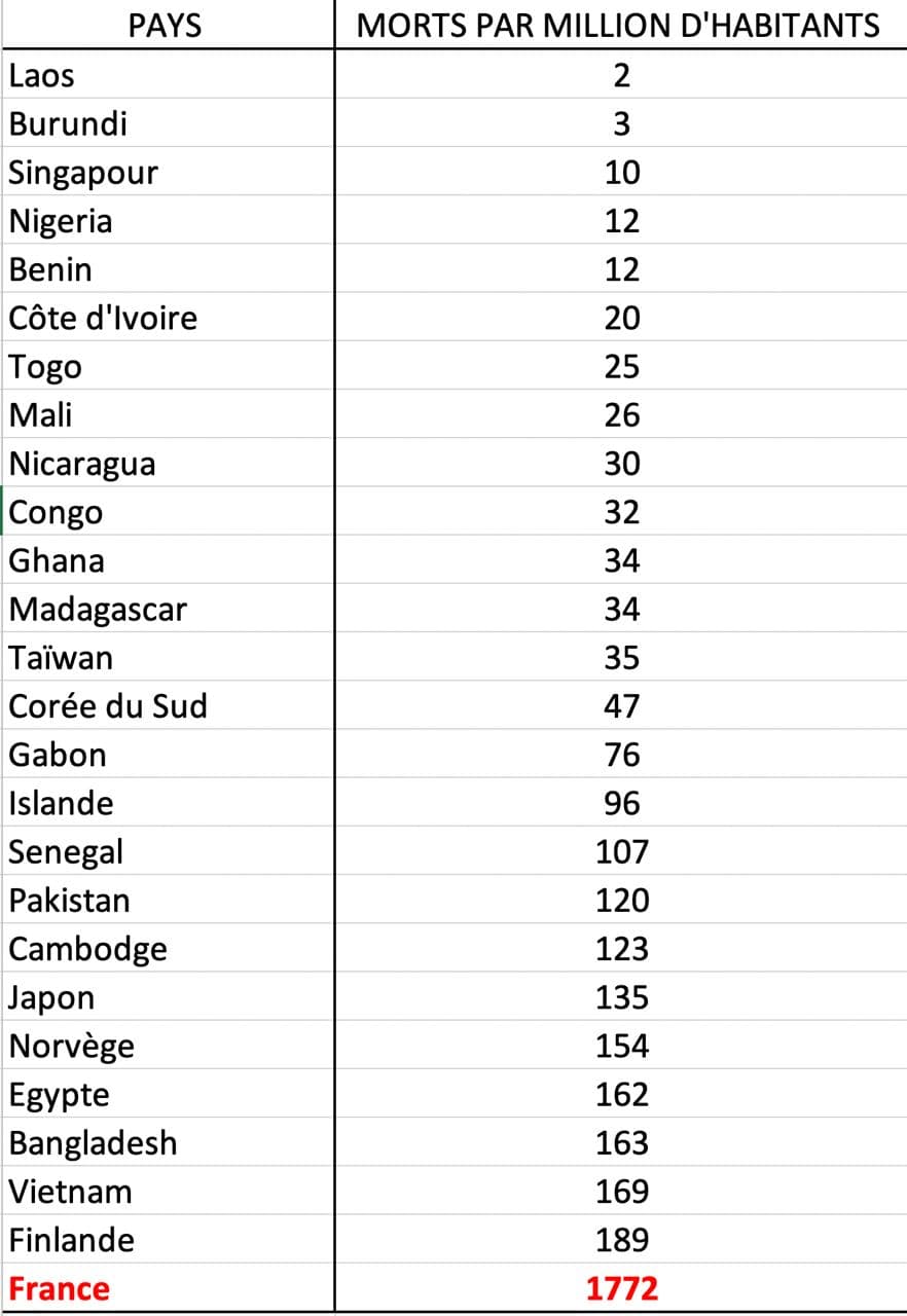 Quand j'entends Veran l'autre jour se pavaner des excellents résultats de la France, devant un journaliste ignare ou aux ordres, il est bon de rappeler certaines vérités. En réalité la France se classe au 193 ème RANG MONDIAL en terme de mortalité par million d'habitants !! Je ne vois pas de quoi pavoiser ! Un petit, tout petit extrait de pays devant la France de Veran !