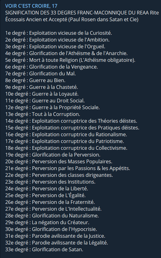 Macron et ses sbires ne seront qu'une tâche dans notre histoire . Aujourd'hui triomphe le monde ordinaire et physique et les maîtres de l'univers terrestre ne règnent que parce que nous sommes soumis à leur sphère d'objets et ne voulons pas voir que notre seule issue est spirituelle . Pour nous français, elle n'est pas Zemmour ou Mélenchon, notre futur, notre postérité ne se trouve pas dans un bulletin de vote, elle se trouve dans le combat pour faire tomber tout le système , pour réveiller ceux qui dorment encore autour de nous . Si vous restez dans le matériel vous avez perdu d'avance car c'est le monde de l'ennemi que nous combattons , notre monde est spirituel . Beaucoup d'entre vous auront du mal à s'adapter à cette nouvelle réalité , et pourtant il doivent bien s'apercevoir que le monde ne tourne plus rond, que la beauté dans la création artistique a disparue et que la promotion de nos plus vils instincts est flatée. Que Lucifer règne en maître avec ses serviteurs et ils ont confisqués tous les pouvoirs de notre planète : argent, pouvoir et religion . .Un exemple, ils ne croient pas en la vie après la mort , diable, mettez-vous à leur place ils savent qu'une fois qu'ils commenceront à manger les pissenlits par la racine ,tous les serviteurs zélés seront à la merci de leur maître , ils deviendront esclaves de Baël, ici ils ont un pouvoir sur nous éphémère , la-bas ils seront des poussières de cendres .