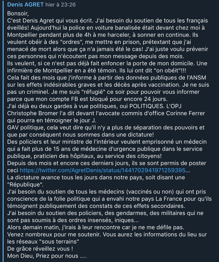 Quand on lit le témoignage du Docteur Agret, certains vont nous dire que nous serions en démocratie ! Nous ne sommes plus dans un Etat de Droit, il faut en être conscient !