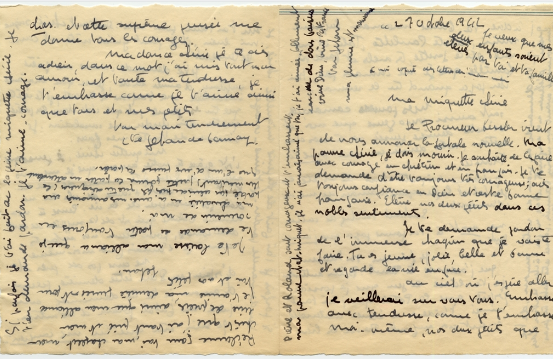 Ma plume est mauvaise. Je veux que mes deux enfants soient élevés par toi et ta famille. Réclame pour toi mon chapelet, mon Christ que j’ai tant prié et mon livre de prières, ainsi que mon alliance. Ma dernière pensée est pour toi et nos petits. Jehan Je te demande, au nom de notre amour, de te guérir, d’élever nos enfants et de ne pas tâcher de rentrer dans un couvent avant au moins 5 années, passée cette date tu feras ce que tu voudras. Je compte sur toit. Si parfois je t’ai fait de la peine Miquette chérie je t’en demande pardon. Je t’aime. Courage. Garde cette lettre que tu remettras plus tard à mes petits.