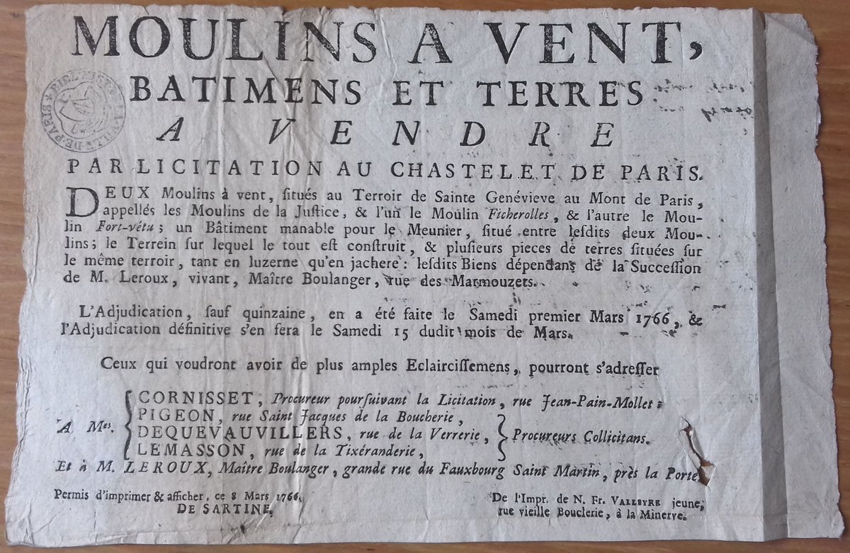 Calimero Du Texas a retweeté Bibliothèque historique de la Ville de Paris @bibhistorique · 20 oct. Moulins à vendre ! Cette affichette de 1766 annonce la vente de 2 moulins dans le quartier Sainte-Geneviève. Les hauteurs de Paris (Montmartre, Montparnasse...) étaient des endroits propices pour y installer des moulins à vent : il y en aurait eu jusqu'à 300 !