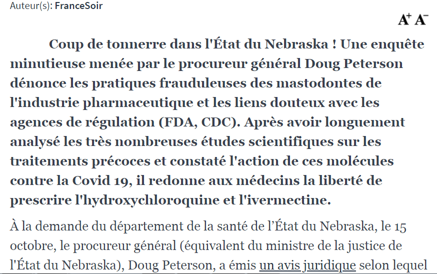 les médecins peuvent légalement prescrire de l'ivermectine et de l'hydroxychloroquine pour le traitement contre le Sars-CoV-2, à condition d'obtenir le consentement éclairé du patient. Une enquête minutieuse qui a précédé la décision Peu de sujets ont suscité autant de controverses que les traitements précoces par ivermectine et hydroxychloroquine, deux médicaments peu coûteux et connus de longue date, largement utilisés avec succès dans de nombreuses régions du monde pour la prévention et le traitement de la Covid 19. Ces deux molécules ont déchaîné les passions. À en perdre la raison. Les publications sont nombreuses et certains médecins les administrent encore aux États-Unis, même si les agences de régulation ne recommandent toujours pas ces deux médicaments alors que certains praticiens sont poursuivis pour les avoir prescrits. Malgré cette situation, certains scientifiques ont publié des études dans lesquelles ils apportaient des preuves d’efficacité et la médiatisation de certaines d’entre elles montrant de bons résultats ont conduit Dannette Smith, chef du département de la santé et des services sociaux du Nebraska (Uniform Credencial Act) à demander au bureau du procureur général si les médecins pouvaient prescrire l'ivermectine ou l'hydroxychloroquine.