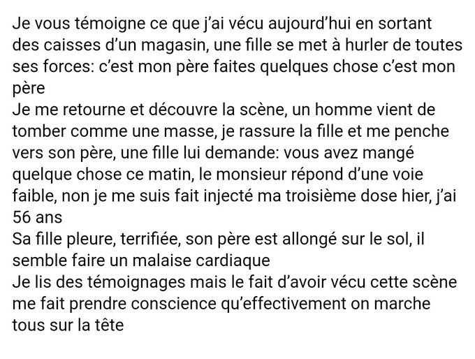 MAGIC Gerry @MAGICGerry1 · 6h En discutant avec le voisin,j'apprend qu'il a RDV pour se faire injecter la 3e dose demain & que son père (injecté 3d aussi) ne va pas bien du tout depuis qqes jours (ne boit plus,ne mange plus,etc.). Ayant discuté déjà avec lui des vax, je lui ai simplement dit:"A toi de voir"