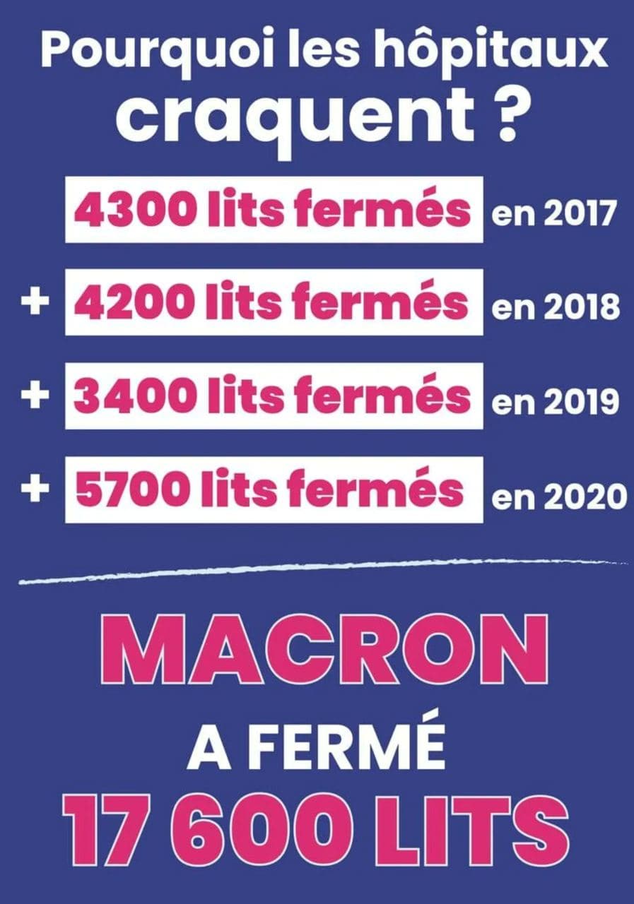 Jetons un œil sur cette cinquième vague qui justifie l'instauration d'une troisième dose, la vaccination prochaine des enfants, l'extension dans le temps du passe sanitaire, le retour du masque partout y compris en extérieur, la politique de terreur permanente, etc.) : Département de l'Ain : 650 000 habitants. Taux d'incidence : 700, soit 14 fois le niveau d'alerte. Personnes hospitalisées : 86, soit 0.01% de la population. Personnes en réanimation : 10, soit 0% Moyenne décès quotidiens sur la semaine écoulée : 0. Allez sur Covid Tracker et amusez-vous à regarder vos départements : c'est comme ça partout. Certains départements affichent des niveaux de saturation des hôpitaux de 100% avec... 8 personnes en réanimation. Certains affichent des taux d'incidence de 5, 6, 7, 10 fois le seuil d'alerte (qui est de 50) avec des niveaux de saturation des hôpitaux de 35% à peine. En gros : il y a des départements qui sont tellement des déserts médicaux qu'ils saturent à partir de 8 personnes en réa. Voilà surtout ce que ce virus permet de mettre en lumière. Inutile de vous préciser que ces départements sont saturés tous les hivers, ne serait-ce qu'avec le grippe saisonnière. Pour autant, malgré cette décorrélation entre le chiffre des cas positifs et celui des réas et des hospitalisations, le gouvernement continue d'utiliser le nombre des cas pour justifier une politique qui sert surtout à cacher que l'hôpital public est en ruines. Le problème n'est donc pas qu'il y aurait saturation des hôpitaux, le problème c'est qu'il n'y a plus d'hôpitaux. Et le responsable de ce problème-ci, ce n'est pas Jeannot qui met son masque de travers ou qui refuse de faire sa 8ème dose : les responsables ce sont les politiques qui depuis 40 ans détruisent l'hôpital et qui pour détourner l'attention font maintenant peser cette responsabilité sur le masque mal porté de Jeannot. Autrement dit et à mes yeux c'est très clair : quiconque continue de valider l'hystérie covidienne est, consciemment ou non, volontairement ou non, en actes ou en pensées, un traître au peuple et un larbin de l'oligarchie.