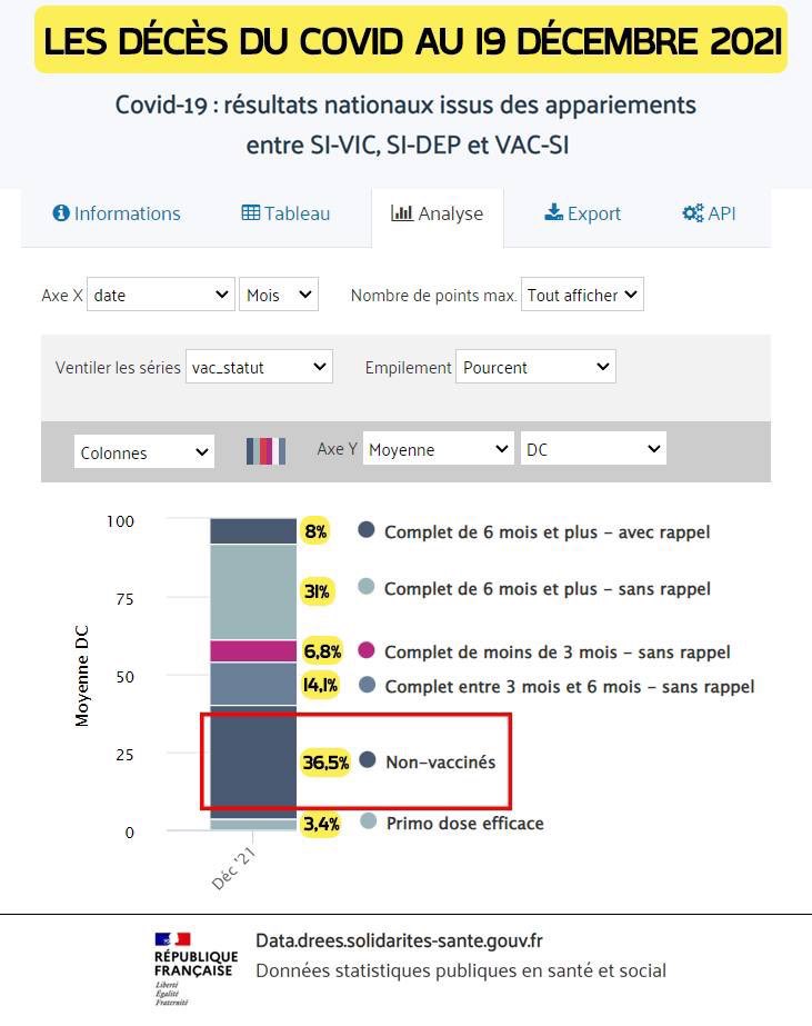 ⚠️ Idée pour ceux qui aiment écrire , qui veulent déposer plainte La propagande gouvernementale actuelle voulant justifier les mesures liberticides , utilise « l'augmentation du nombre de cas » Mais un « cas » ne veut pas dire une personne malade, ni un décès Sans parler du fait que les tests PCR ne sont pas fiables Exceptionnellement, l’Insee diffuse régulièrement le nombre de décès (toutes causes confondues) par jour et par région et département La dernière mise à jour des fichiers , en date du 17/12/2021 , fait apparaître qu'en comparant les années 2019, 2020 et 2021, le nbre de décès de 2021 suit à peu près la même courbe que 2019. Mais, en tout état de cause, ne fait pas apparaître de 3ème vague et encore moins de 4ème vague
