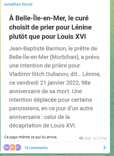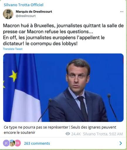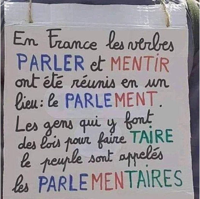 Pendant ce temps-là, en France, une presse corrompue tente de faire croire que le Diviseur est en tête des sondages, loin devant tout le monde, avec 50 % d’opinions favorables et 26 % des intentions de vote au premier tour du 10 avril 2022... C’est précisément pour punir toute explosion de vérités que Dupond a été nommé ministre de la Justice, mandaté pour transformer le ressentiment que les Français vouent à ce président diviseur et destructeur en « haine », puis en « terrorisme », puis en peines de prison. Ne pas se soumettre à la politique ce dingue sera bientôt pénalisé !