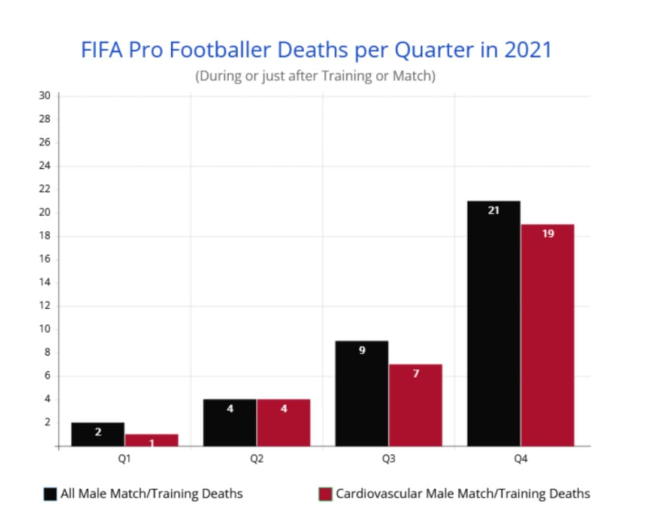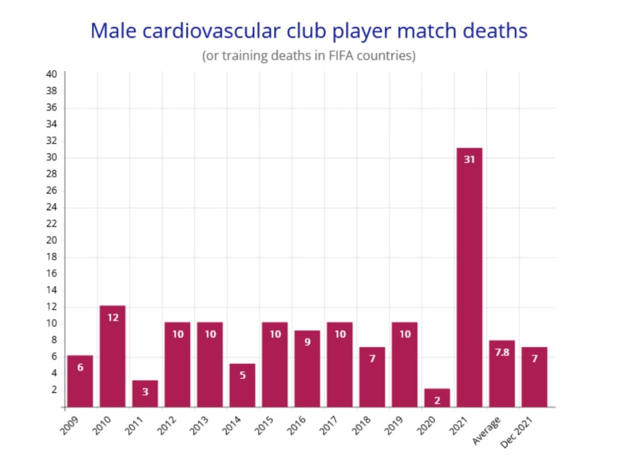 2. Bien sûr il y a toujours eu des sportifs de haut niveau, morts de crises cardiaques. Mais les décès dans le football (FIFA) en décembre 2021 à eux seuls correspondaient à la moyenne annuelle des 12 dernières années !!! Réveillez-vous les gars ! https://dailyexpose.uk/2022/01/23/deaths-footballers-dec-21-equal-to-annual-12-year-average/