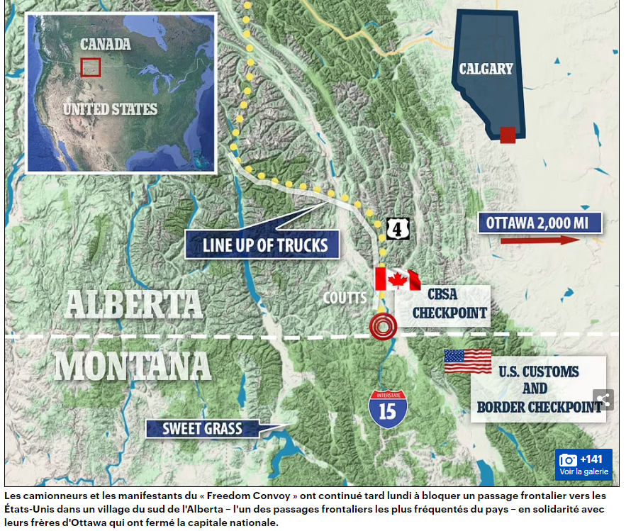Les camionneurs et les manifestants du "Freedom Convoy" ont continué tard lundi à bloquer un passage frontalier vers les États-Unis dans un village du sud de l'Alberta - l'un des passages frontaliers les plus fréquentés du pays - en solidarité avec leurs frères d'Ottawa qui ont fermé la capitale nationale. Les automobilistes qui traversent la frontière entre le Montana et l'Alberta ont été pris dans un blocus de véhicules qui ont essentiellement fermé l'autoroute au sud de la ville de Lethbridge, en Alberta, à 65 milles du passage frontalier canado-américain dans le village de Coutts. Bien qu'elle soit à 2 000 milles d'Ottawa, la manifestation est directement liée à ce qui se passe dans la capitale canadienne où les manifestations se déroulent dans un quatrième jour contre le premier ministre Justin Trudeau et les mandats de vaccin COVID-19 – qui obligent les camionneurs non vaccinés à passer un test PCR et la quarantaine. Plus tôt lundi, Trudeau a déclaré qu'il ne rencontrerait pas les camionneurs qui envahissent actuellement Ottawa pour protester contre son mandat de vaccination en raison de leur "rhétorique haineuse".