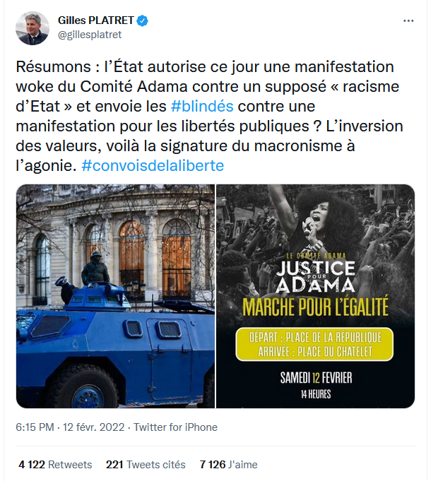 - Soit le mouvement prend et crée des situations similaires à celle d'Ottawa, c'est-à-dire des blocages & une tension croissante qui déboucheront immanquablement sur des évacuations par la force et des affrontements si des éléments énergiques et déterminés rejoignent un mouvement qui pour le moment a l'air plutôt bon enfant. Exactement comme les Gilets jaunes qui ont commencé avec trois retraités sur un rond-point perdu dans la Creuse pour finir en vagues énormes à Paris. Auquel cas, la macronie n'aura qu'à lever le passe pour que tout le monde rentre chez soi. Contrairement aux Gilets jaunes qui n'avaient pas des revendications aussi claires et circonscrites, les convois ont, quant à eux, un objectif précis qui est de faire lever le passe. Pour Macron, désamorcer la crise sera simple, il lui suffira de lever le passe.