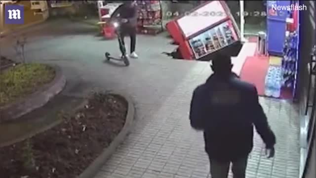 C'est le moment où un propriétaire de magasin a disparu dans un gouffre de 20 pieds qui s'est ouvert sous lui après qu'il soit sorti pour une pause cigarette. Des images filmées le 4 février dans le quartier Kadokoy d'Istanbul montrent Omer Kacagan parlant au téléphone tout en fumant devant le magasin Nehir Tekel. Alors qu'il se dirigeait vers deux distributeurs automatiques, le sol s'est effondré et il a plongé dans le trou, avec l'une des machines. Bien qu'il ait déclaré que l'un des distributeurs automatiques lui était tombé dessus, Kacagan a déclaré qu'il n'avait subi que des blessures mineures et qu'il avait été secouru par les pompiers dans les 25 minutes.