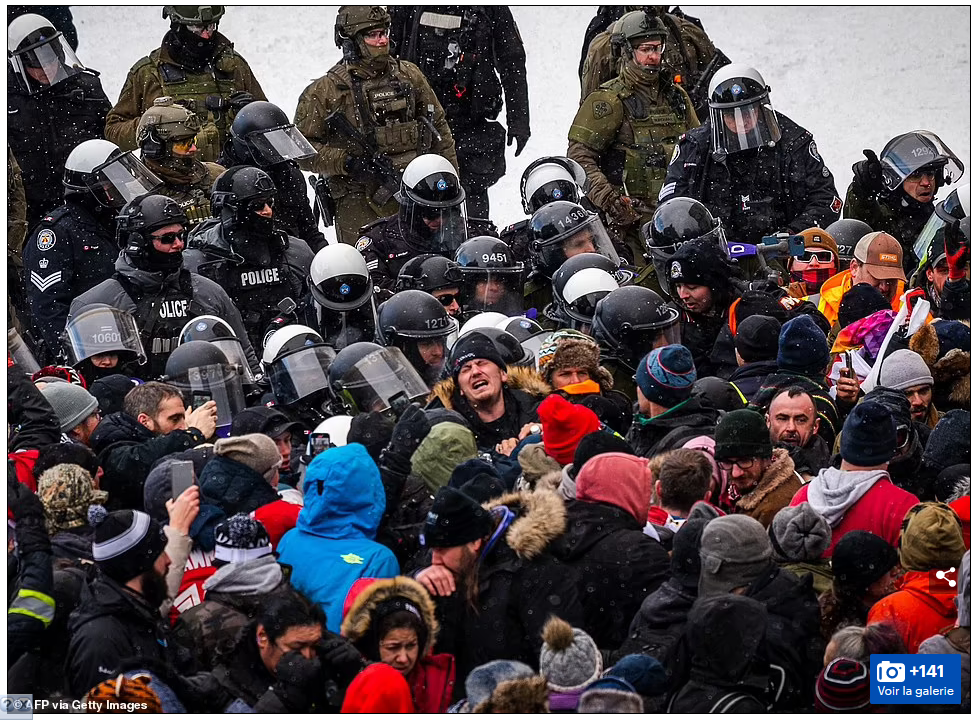 Des flics anti-émeute armés affrontent les derniers manifestants du Freedom Convoy - après que le Premier ministre canadien a déclaré la loi martiale et que le Parlement a SUSPENDU le débat sur la tentative du chef éveillé (Trudeau) de promulguer des pouvoirs d'urgence draconiens .