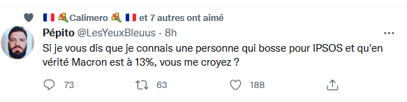 Ils nous ont menti sur le Covid, ils nous mentent sur les sondages, Macron, le président le plus impopulaire de France depuis 1945, ne saurait caracoler dans les hautes sphères d intention de vote , alors pourquoi ne mentiraient-ils pas sur l'Ukraine ? Il y a une petite musique qui pointe le bout de sa mélodie et nous chante : ``On ne change pas de président en période de crise grave "Surtout quand il est mauvais, et qu' il a loupé toutes ses interventions internationales.