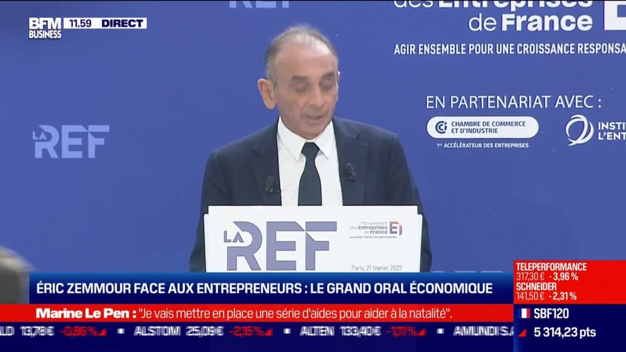 Le Medef a accueillit froidement Eric Zemmour hier lors du grand oral économique face aux entrepreneurs qu'ils ont organisé avec BFM Business . Vous pensez bien que les grands patrons sont macroniens. Après avoir paralysé la France deux mois, il fait indemniser les patrons , c'est vrai qu'il y a eu beaucoup moins de faillites qu'on aurait pu l'imaginer .