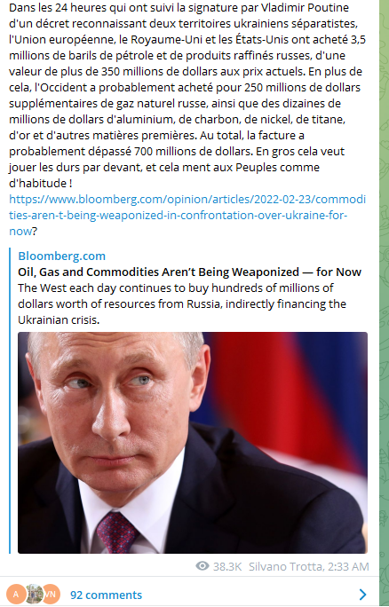 Le perdant encore une fois sera le peuple ukrainien. Bruxelles en ayant fait miroiter l'entrée dans l' UE et promis des aides financières en envoyant des ONG anti-russes ils ont préparé le terrain pour les chars russes qui sillonnent la boue du sol ukrainien ... L'Amérique a ce qu'elle voulait, couper les ponts entre Moscou et les capitales européennes, ainsi le pétrole et le gaz seront livrés par bateau à Hambourg.Par contre l'Allemagne, l' UE et l' Angleterre ont fait le plein avant de partir , ils ont signé un contrat important de pétrole , de gaz , de charbon et d'aluminium . C'est après avoir signé ces contrats importants qu'ils ont annoncé les sanctions contre la Russie . Je pense qu'ils ont accordé leurs violons avec la diplomatie Poutine avant d'annoncer les sanctions, ne jamais sous-estimer son adversaire .Imaginons que l' Allemagne et la France se seraient tourné vers Moscou économiquement , ce serait la fin de l' hégémonie américaine sur le sol européen , et l' Otan n'a plus lieu d'exister depuis la fin du pacte de Varsovie.Si la riposte américaine est puissante, Washington ne sait pas faire dans la dentelle , alors la Russie peut se rapprocher des chinois et faire une armée super puissante .