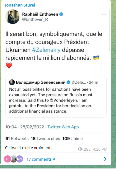 Il m'apparait assez lisiblement que Zelensky est un clown qui n'a aucune prise sur les événements en cours, qu'il n'a ni les épaules ni le cran pour gérer une telle situation face au monstre froid du Kremlin. Virtuellement, ce n'est peut-être déjà plus lui qui commande aux destinées de l'Ukraine, sans doute même depuis son élection.
