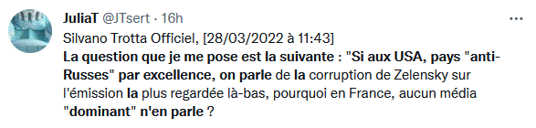 Les Gilets Jaunes vaincront il y a 16 heures 9:00 : Eric Dénécé (Directeur du Centre Français de Recherche sur le Renseignement) : "J'avoue que je suis extrêmement choqué par l'écho médiatique et l'aura que l'on donne à Volodimir Zelensky qui est un acteur, un comédien (...) qui est responsable de ce qui se passe, lui et son entourage, n'oublions pas qu'il a été élu avec les voix des Russophones en 2019, il n'a pas appliqué les Accords de Minsk pour lesquels il avait été élu, ensuite il ne faut pas oublier que c'est un homme qui avait été mis en cause par les Pandora Papers, ce ne sont pas des racontards, il est accusé d'avoir dissimulé une grande partie de sa fortune, notamment avec sa société Maltex. Dès qu'il a été élu, il a nommé Sergei Shefir, qui était son producteur, comme principal conseiller. On sait aussi qu'il est accusé d'avoir blanchi près de 40M$ de l'oligarque Kolomoisky. Donc on a là quelqu'un qui est une forme de satire, je trouve qu'il faut le dire, et qui fait une véritable politique de communication très astucieuse mais qui commence à se retourner contre lui. On l'a vu devant la Knesset il y a quelques jours où il a comparé ce qui se passait dans l'Est de l'Ukraine à la Solution Finale, alors inutile de vous dire que pour la moitié des élus israéliens c'était un véritable scandale, il nous a rejoué un grand coup de violon devant le parlement français sur, vous le disiez tout à l'heure, le rapport entre Marioupol et Verdun, ça ne tient pas la route, et aujourd'hui, le chef de la diplomatie ukrainienne, qui est un de ses principaux adjoints, est en train de nous dire ce qu'on doit faire, c'est-à-dire que c'est lui qui décide de provoquer un boycott contre les produits, contre les magasins Auchan en Russie ... Donc, ces gens qui ne représentent rien, ces gens qui n'ont cessé d'être manipulés volontairement par les Américains, je parle du gouvernement ukrainien, sont aujourd'hui responsables de ce qui se passe dans leur pays. Je fais une nette différence entre cette population ukrainienne qui est victime de la guerre et ce gouvernement qui a une énorme responsabilité, et au lieu de communiquer comme il le fait, on serait plutôt en droit d'attendre de sa part qu'il présente des excuses pour avoir été, un, à l'origine de ce conflit, et finalement il contribue à l'extermination de sa population."