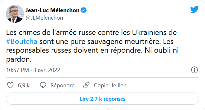 Dans cette histoire de Boutcha, même en admettant qu'il y a eu des civils exécutés il reste néanmoins à déterminer par qui, quand, comment et où ils ont été tués avant de lancer la moindre accusation de crime de guerre. D`ores et déjà plusieurs faits incontestables apparaissent déjà pour accréditer la thèse russe d`un massacre réalisé par des agents ou des nationalistes ukrainiens suivi d`une mise en scène macabre destinée à diabolise encore plus la Russie afin de pouvoir augmenter les représailles économiques contre elle et les aides militaires à l`Ukraine ainsi que de faire accepter par les populations occidentales leurs dommages collatéraux.