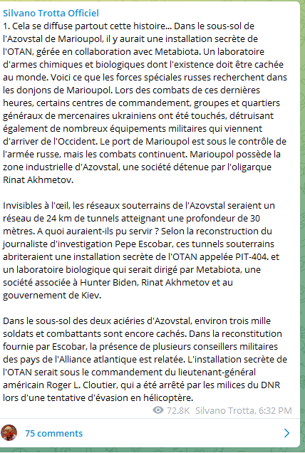 Au Kremlin: la destruction de la garnison d'Azovstal entrainerait la fin des négociations, A noter que l'Etat Major ukrainien a signifié que tout combattant qui chercherait à se rendre sera "abattu à vue", sur ses ordres explicites, par les militants du régiments "Azov".