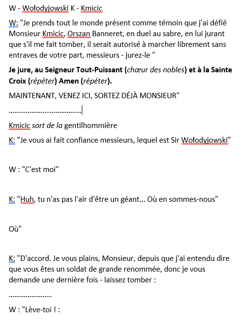 C'est probablement la scène de combat à l'épée la plus dangereuse jamais réalisée. Ces acteurs sont de vrais acteurs qui ont appris à tirer au sabre polonais. L'ensemble du combat est une chorégraphie mise en scène, mais en plein contact avec des sabres émoussés (mais toujours en acier véritable) sans autres précautions de sécurité. Dans d'autres chorégraphies de combats à l'épée, vous pouvez voir de larges circovolutions dirigées vers l'arme ou au-dessous ou au-dessus de l'adversaire pour des raisons de sécurité - Si quelque chose ne va pas, la lame ne touchera pas l'autre acteur. Même le coup le moins puissant à la tête peut être vraiment nocif ou même mortel avec une arme contondante - imaginez que votre tête soit frappée avec une fine barre de métal, car c'est ce qu'est une lame émoussée. En fait, l'enregistrement de cette scène s'est presque terminé par un accident, car l'acteur jouant Wołodyjowski a à peine réussi à bloquer une frappe involontairement puissante dirigée vers sa tête. Malheureusement, ce moment n'est pas filmé , comme l'acteur le mentionne dans l'interview, il était tellement choqué qu'il a interrompu le combat et a dû faire une pause assez longue, ce qui a entraîné la reprise de toute la scène.