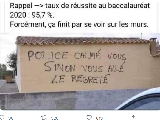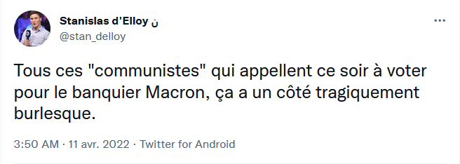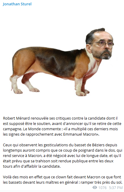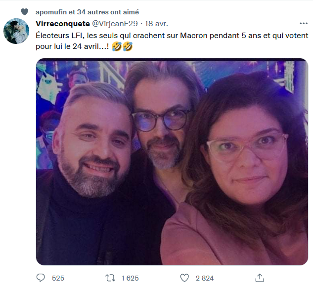 On apprend que Mélenchon et Macron ont échangé des SMS, dans lesquels Mélenchon, après lui avoir rappelé qu'il avait donné des consignes strictes de ne pas voter MLP, réclamait de Macron qu'il envoie un signal aux électeurs mélenchonistes pour les faire bouger en faveur du président sortant. Dans la foulée, on a le signal en effet : une séquence vidéo où Macron, totalement sous coke, se pâme devant une femme voilée, lui déclare presque sa flamme et affirme que «c'est beau» une femme voilée qui est pour l'égalité. En somme, quand Mélenchon demande à Macron d'envoyer un signal à ses électeurs, Macron organise une séquence avec... une musulmane voilée. Quel aveu. J'espère que les électeurs blancs de Mélenchon vont comprendre qu'ils ne sont rien, ni pour Mélenchon ni pour Macron. Et en tirer les seules conclusions électorales qui s'imposent.
