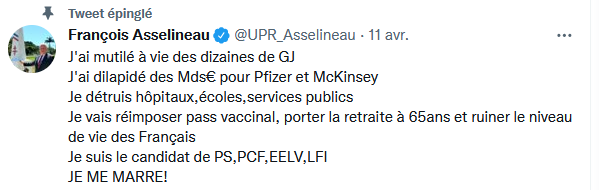 3. Parce que ne pas voter contre Macron c'est valider Castex, Darmanin, Véran, Ferrand, Castaner, etc., la tyrannie sanitaire, l'abonnement Pfizer, McKinsey, la repentance, le transgenrisme à l'école, l'avortement jusqu'à 9 mois de grossesse, le crédit social, les passes sanitaire et bientôt écologique, l'écriture inclusive, etc.
