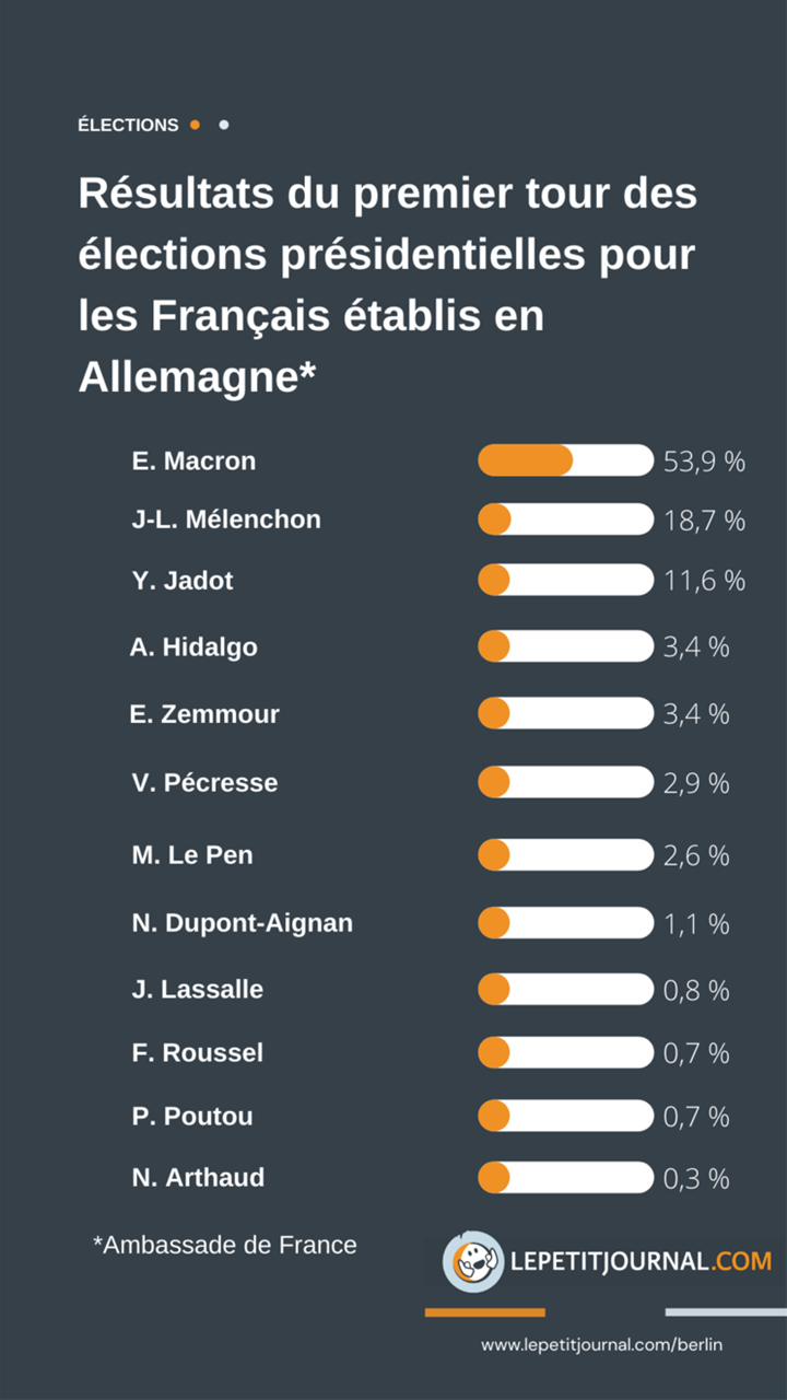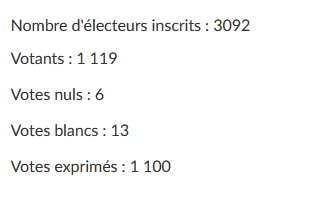 3621 Français ont voté ce dimanche 10 avril, sur les 7624 électeurs inscrits, soit une participation de 47,50 %. Emmanuel Macron arrive largement en tête avec 45,15%.