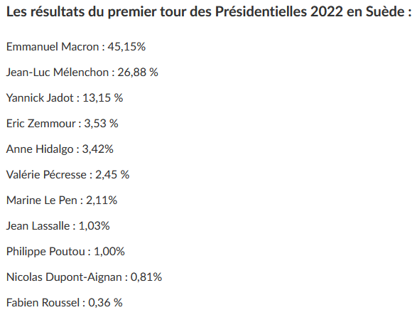 Le 1er tour des élections en Suède en chiffres: Nombre d’inscrits : 7624 Nombre de votants : 3621 Suffrages exprimés : 3597 Votes blancs : 19 Nombre de bulletins et d’enveloppes annulées : 5 Taux de participation : 47,50 %