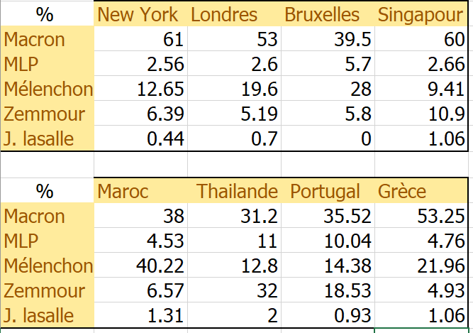 Si on voit le tableau vote 1er tour des français de l'etranger : Macron 45% Mélenchon 22% et MLP a 5.3%. Mélenchon aurait dû être n° 2.