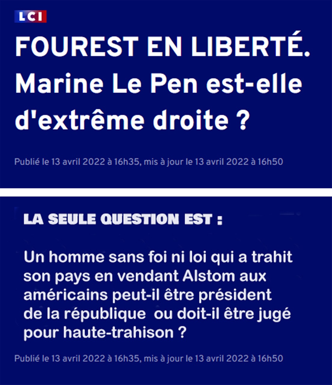 🇫🇷 Si Marine Le Pen veut marquer l’histoire, tout ce qu’elle a à faire c’est de faire à Macron ce que Macron fait à tout le monde en refusant le débat du second tour puis faire un discours où elle appelle à l’union nationale en dénonçant le danger mondialiste que représente Macron et sa clique. Si elle a ce courage, les français la suivront . Elle a le choix entre marquer l’histoire en faisant ça ou juste nous prouver qu’elle est une marionnette comme Melenchon et tous les autres en jouant le jeu du système, c’est à dire, nous la refaire comme en 2017.