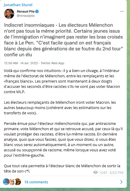 Mélenchon est responsable de ce qui va tomber le 24 avril comme un couperet sur nos têtes : Macron 2. S'il aimait son pays, il organiserait un cordon sanitaire et une front de coalition contre Macron et ses malfrats avec toutes les forces patriotiques du pays y compris le RN, il restera dans l'histoire comme l'homme qui à ouvert le boulevard de Macron.