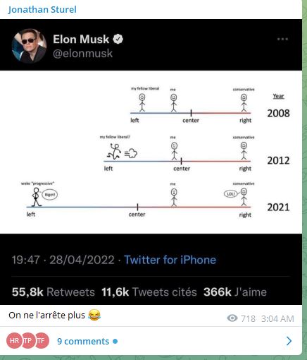 L'arrivée d'Elon Musk, militant anti-woke partisan de la liberté d'expression, peut et aura sûrement l'effet d'un probiotique qui rééquilibrera l'équilibre sur Twitter, en empêchant les wokes de détruire les forces contraires. Il suffit d'enlever le bouton «signaler ce tweet» et le despotisme woke s'écroule.