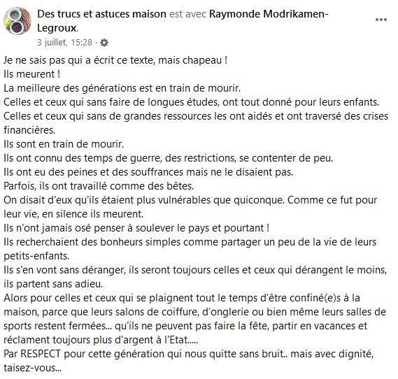 Tenez, imaginez la génération qui va nous suivre, elle a 18 ans aujourd'hui , ils passent le Bac qui figurez-vous est en dessous du niveau du CEP (certificat d'études primaire ) de 1970 ! Doivent-ils se taire aussi ? Ils ont le nez dans leur tablette du matin au soir sauf quand ils dorment. L'école est une garderie d'enfants , ils n'apprennent plus rien, doit-on se taire et laisser faire nos élites ? Doit-on vider les bibliothèques et les remplacer par des vaccinodromes ? Alors ne dites pas n'importe quoi et surtout contestez ce monde inique , si nos parents et nos aïeux ont souffert c'est pour que nous allions à l'école et pas au fond de la mine ou dans un atelier , ils rêvaient d' avoir des enfants instruits .