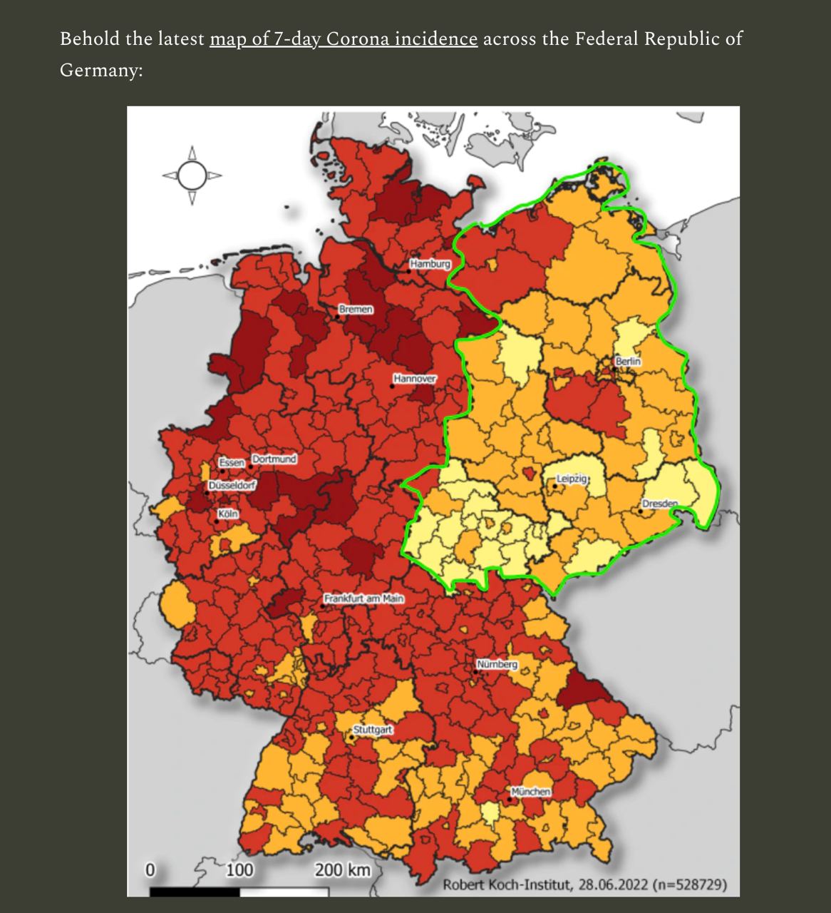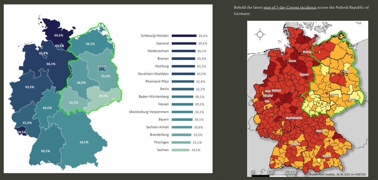2. Et voici la carte des taux de vaccinations... Les Allemands de l'Est ont une expérience directe de la propagande gouvernementale et se sont montrés plus résistants à la campagne de vaccination que les Occidentaux. Leur récompense, après avoir été très malmenés par les médias d'État, est maintenant un niveau plus élevé d'immunité naturelle et un taux plus faible d'infection par le BA.5, qui semble préférer les populations vaccinées. Au fur et à mesure que les effets de l'échec de la vaccination deviennent plus clairs, on peut se demander combien de temps les pandémistes pourront publier des statistiques d'infection, même simples, sans soulever des questions extrêmement gênantes. https://www.eugyppius.com/p/omicron-ba5-prefers-hypervaccinated