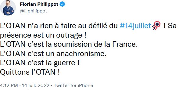 Il se trouve sur le net une cohorte pour défendre la chose. Ce sont les mêmes qui fournissent un auditoire au concours de l’Eurovision. À chacun son mauvais goût. Celui de notre PR est insondable. Les réaménagements de l’Elysée nous en ont donné un avant-goût. Son « Bonjour Messieurs-dames » lancé cet après-midi aux victimes d’attentats ne remonte pas le niveau. Pas plus que les chaussettes blanches de son Sinistre de la Santé ou son baise-main public de la main gauche déplacé. J’arrête mes persiflages snobs et futiles. La vraie raison, au fond, de cette mascarade de chanteuse du Caesars Palace et de sa ringarde chanson, c’est que les paroles de la Marseillaise sont devenues simplement inaudibles, trop politiquement incorrectes. Quel membre de la macronie pourrait tolérer que l’on chantât : « Quoi ! des cohortes étrangères, Feraient la loi dans nos foyers ! Quoi ! ces phalanges mercenaires Terrasseraient nos fiers guerriers ! » ou encore « Tremblez, tyrans et vous perfides L'opprobre de tous les partis, Tremblez ! vos projets parricides Vont enfin recevoir leurs prix ! » Petit détail pour finir. Je m’étonnais ici-même que la page officielle Twitter du PR, une semaine après qu’il eut quitté la Présidence du Conseil Européen, fut encore uniformément bleue et dépourvue totalement de la moindre référence aux couleurs nationales. Vous pouvez vérifier : en ce jour de Fête Nationale, c’est toujours le cas. Perfide provocateur copieusement hué ce matin (comme jamais je ne l’avais observé à ce point) par le peuple schizophrène qui vient de le réélire.