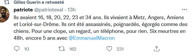 Une partie des français en veulent à ceux qui ont voté pour lui en avril dernier. D’abord ils ne sont qu’à peine 12% des votants, oui ! Seulement ceux qui ont placé un bulletin « Macron » dans l’urne, que voulez-vous ils ont du comprendre leur douleur depuis, Macron est toujours un des premiers chef d’état à prendre des mesures dont les conséquences sont funestes pour son pays. Que les contrariés se consolent ce sont tous des pantins et ils ne détiennent certainement pas le pouvoir .