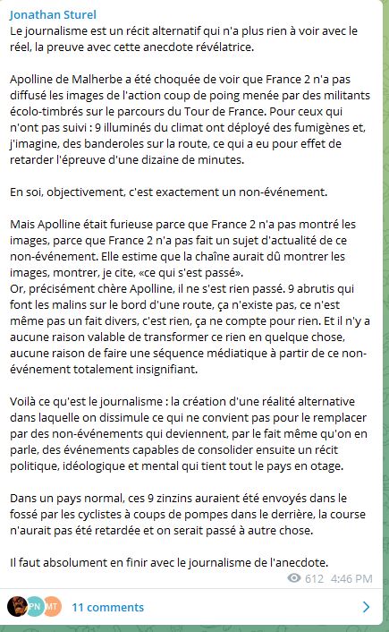 Seul souci : sa grille, ses idées, sa ligne, ses valeurs, c'est un copier-coller de tout ce qui se mixture déjà dans les rédactions parisiennes, sur tous les plateaux télé, chez tous les politicards démagos. Le mec, c'est Médiapart, BFM, Slate, Konbini, L'Huma, LCI, Têtu, Véran, Schiappa, Christophe Barbier, tout ça à lui tout seul.
