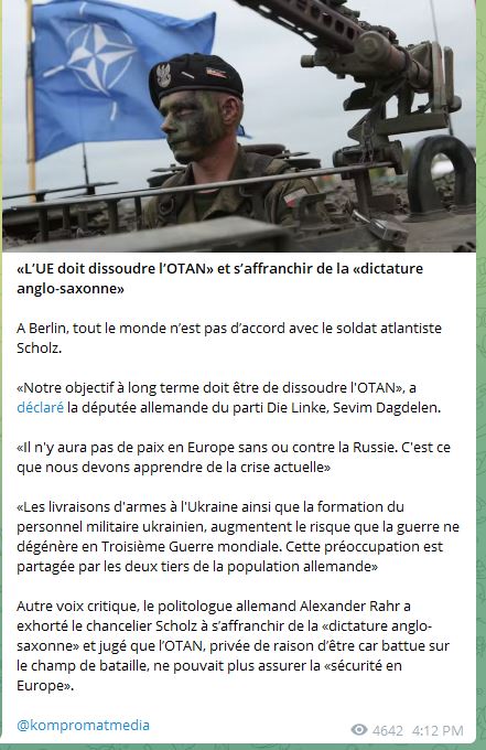 Cette armée française qu'on aime tant et que nous respectons, et pourtant quand les politiques lui donneront l'ordre , les soldats français iront se battre aux cotés des bataillons urkrainiens nazis AZOV contre les russes . Depuis 2014 Kiev envoie ses bataillons pour dérussifier le Donbass , tire des bombes et martyrise la population . L'armée française devrait s'emanciper des pantins politiques aux ordres de Washington.
